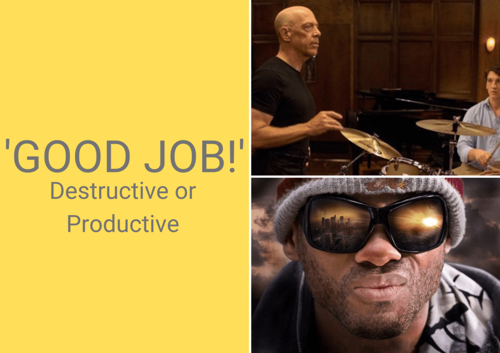 If you’ve seen the movie I’m sure you would think that Fletcher’s actions are outrageous, but allow me to play devils advocate by saying the following; all he wanted was for his band and it’s members to be the best version of themselves they possibly could be. He wanted to breed the next best jazz musician, and was willing to do anything to do so, in his eyes, ‘good job!’ (which is an example of positive reinforcement), is nothing more than an opportunity for complacency: